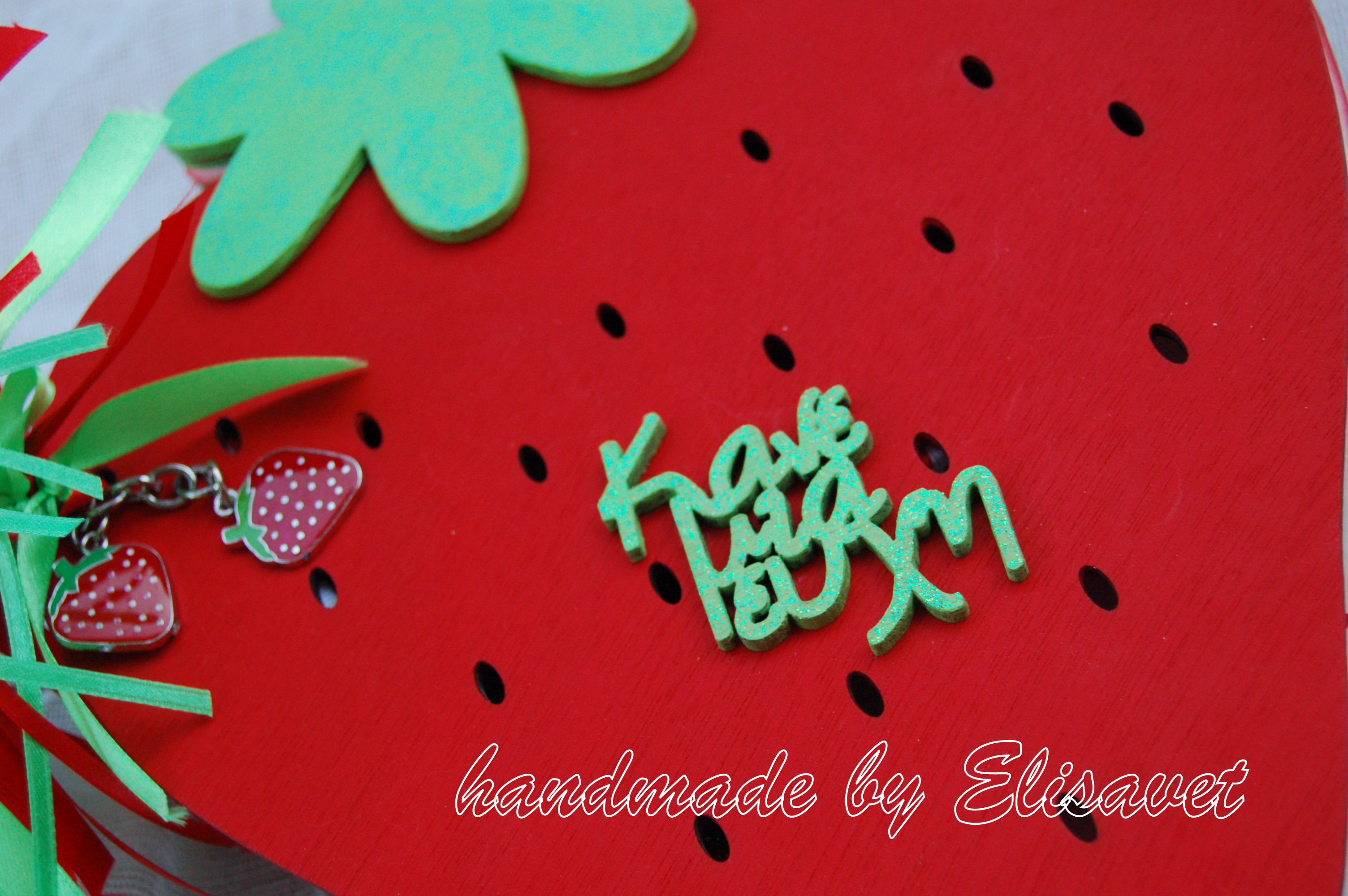 To «κάνε μία ευχή» είναι και αυτό ξύλινο mdf, ενώ στο δέσιμο εκτός από κορδέλες πρόσθεσα και ένα μπρελόκ φράουλας!