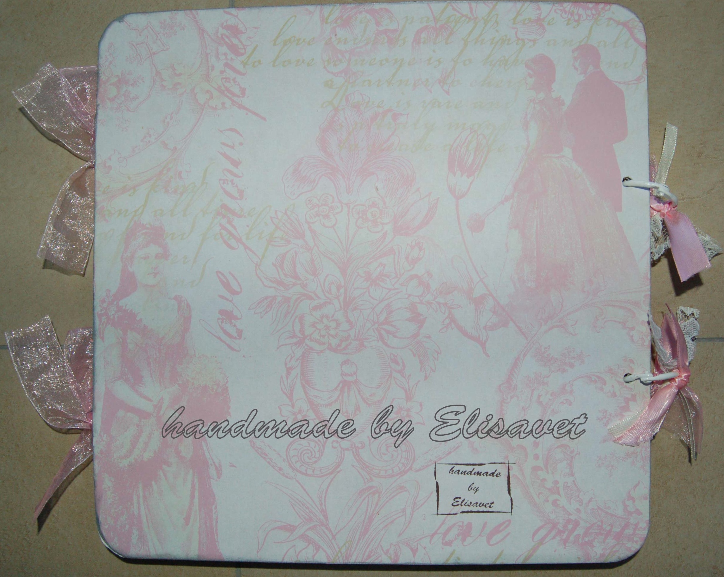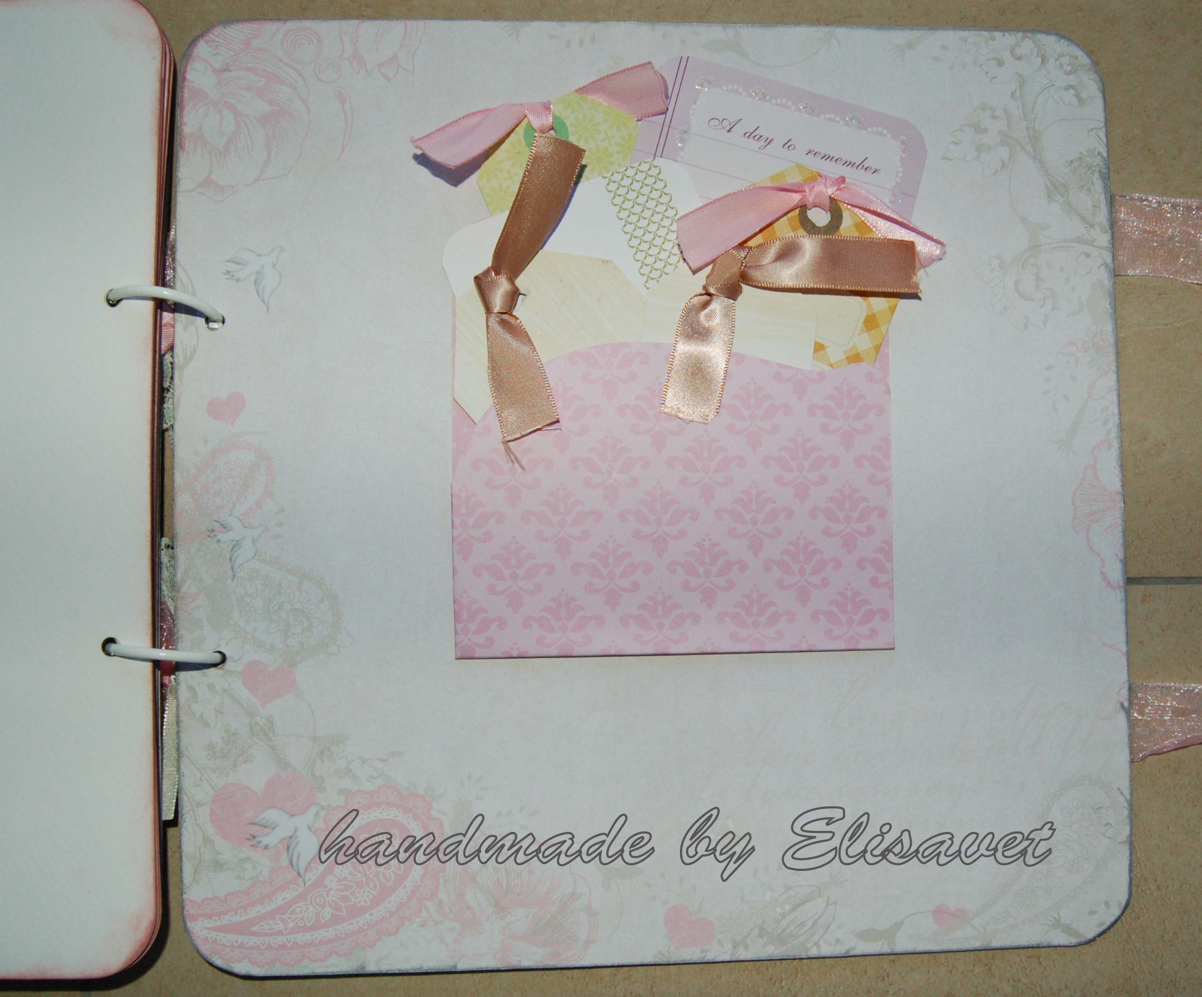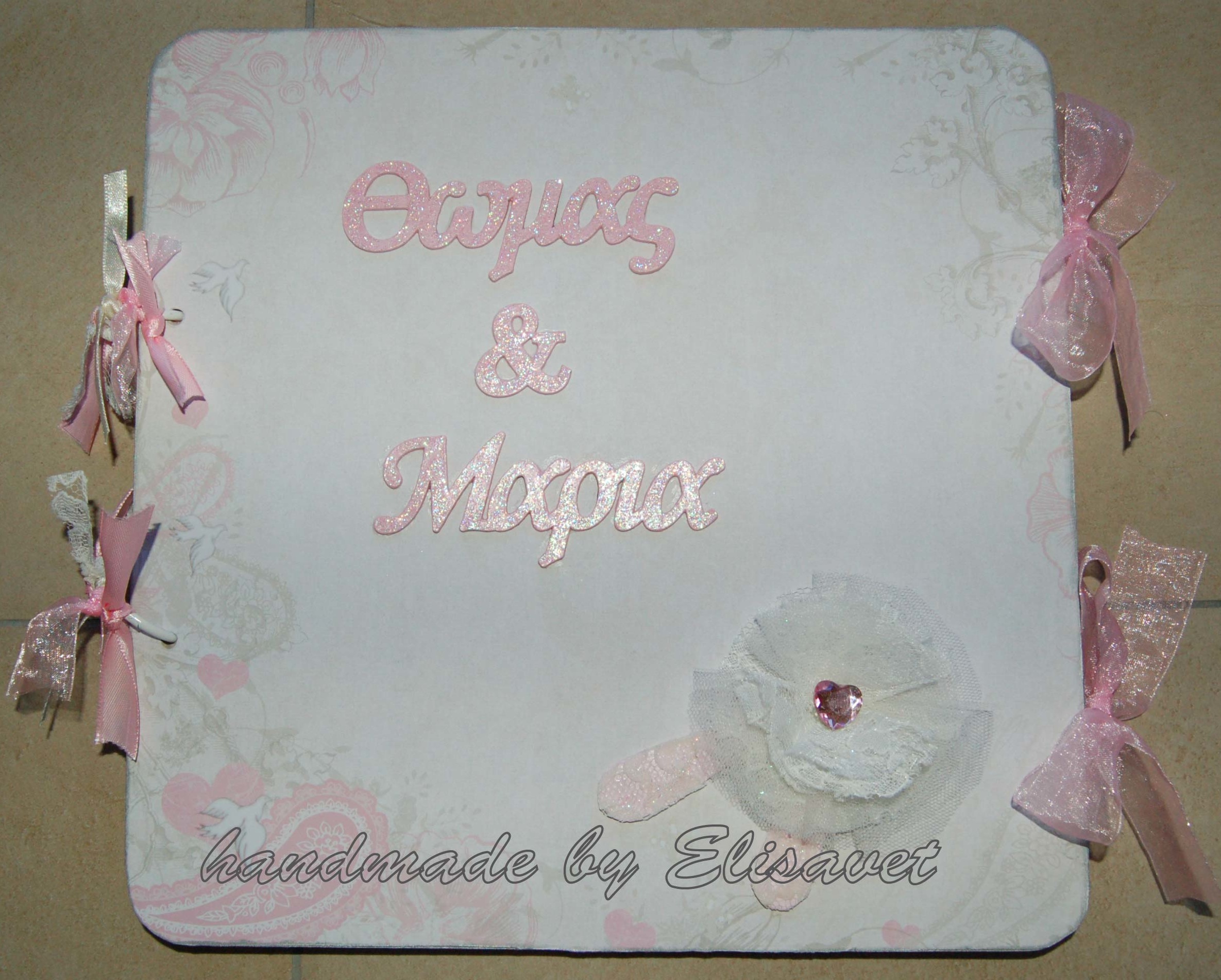 Το εξώφυλλο και το οπισθόφυλλο είναι από ξύλο και συγκεκριμένα mdf, εσωτερικά έφτιαξα δύο φύλλα με τεχνικές scrapbooking και πρόσθεσα φύλλα canson τα οποία σφράγισα και μελάνωσα για να αφήσουν οι καλεσμένοι τις ευχές τους.