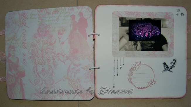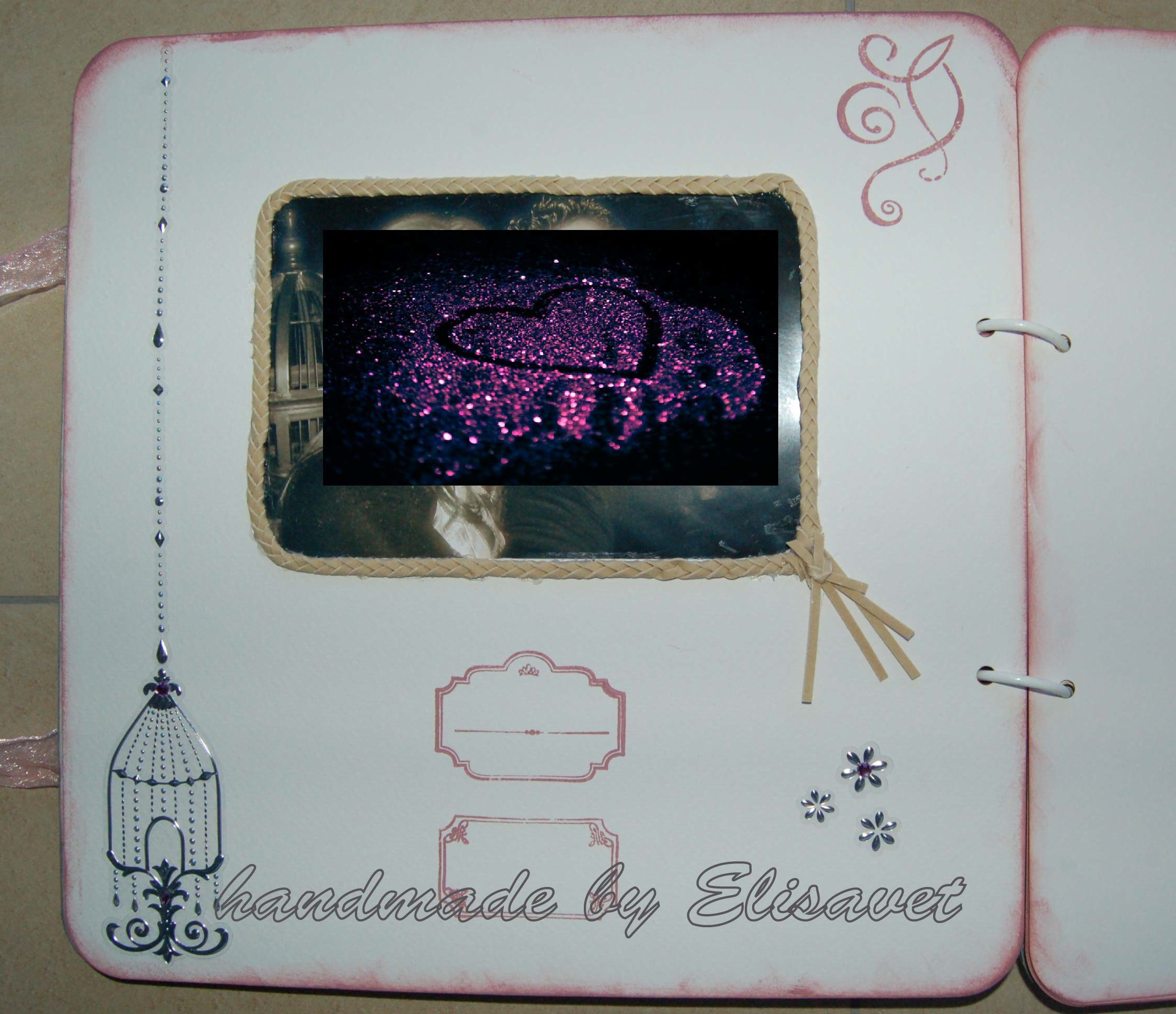 Το εξώφυλλο και το οπισθόφυλλο είναι από ξύλο και συγκεκριμένα mdf, εσωτερικά έφτιαξα τέσσερα φύλλα με τεχνικές scrapbooking και πρόσθεσα φύλλα canson τα οποία σφράγισα και μελάνωσα για να αφήσουν οι καλεσμένοι τις ευχές τους.